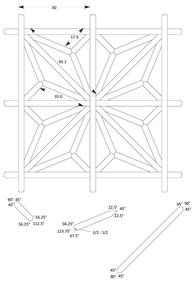 Het patroon van de schermen moest een “asa-no-ha” worden, wat een veel gebruikte vorm is voor Kumiko lantaarns.Daarvoor moeten de kleine stukjes hout afgewerkt worden onder hoeken van 45°, 67.5° en 22.5° en daarvoor had ik vooraf alvast mallen gemaakt.Als hout heb ik gekozen voor walnoot- en lindehout. Ik heb een plank lindehout gehaald en Sander zorgde voor walnoot. De eerste dag werd mijn lindehout direct al herkend als populier. Hmmm, volgende keer toch maar bij de speciaalzaak kopen.Maar goed, Erik van De Schrijn had al snel een plaat lindehout voor me geregeld.Als werkvolgorde ging ik eerst aan de slag met het maken van de schermen omdat het makkelijker is om het frame aan te passen aan het scherm dan andersom.